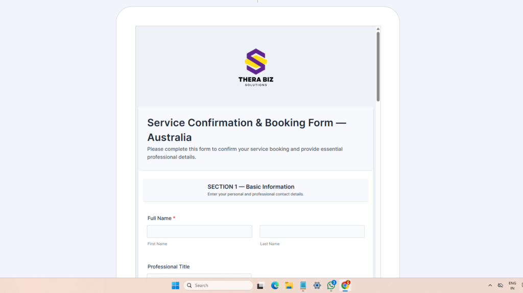 Please complete this form so our team can formalize your onboarding and begin structuring your service immediately after booking. This form is intended only for professionals who have reviewed our full proposal document and decided to proceed. We only require essential information. All information is kept strictly confidential.